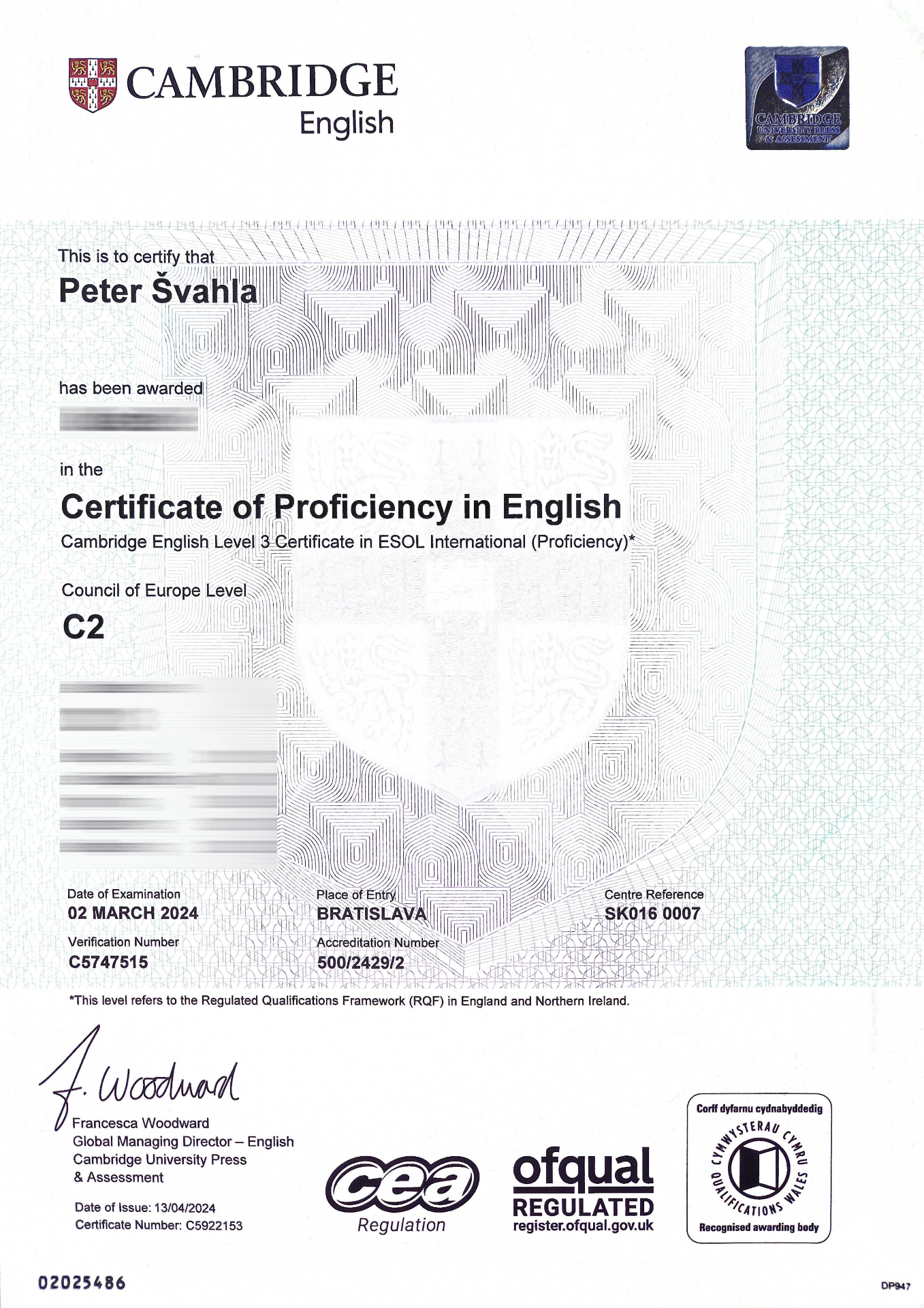 Som držiteľom certifikátu z anglického jazyka Certificate of Proficiency in English (CPE) najvyššej možnej úrovne C2, udeľovaného Cambridge University. Počas svojej pedagogickej praxe som odučil viac ako 7.000 hodín anglického jazyka a súhrnne viac ako 5.000 hodín ostatných cudzích jazykov.